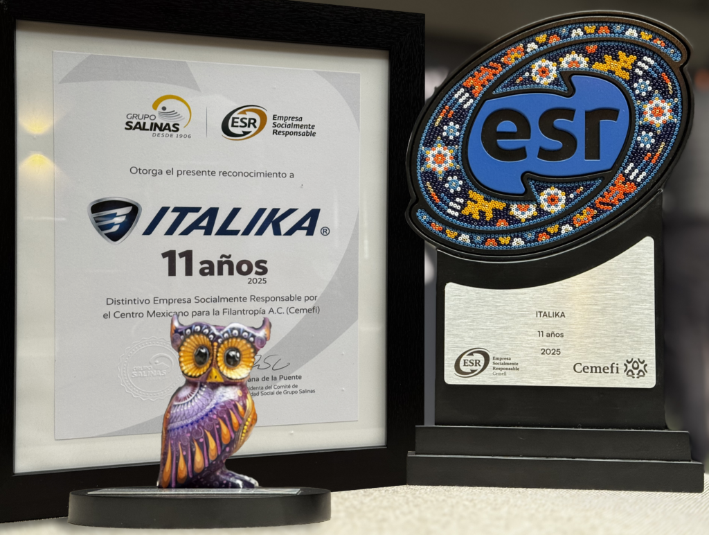El 19 de junio, en el marco del XVIII Encuentro Latinoamericano de Empresas Socialmente Responsables 2025 (ESR), organizado por el Centro Mexicano para la Filantropía (CEMEFI), ITALIKA fue reconocida una vez más como Empresa Socialmente Responsable. Este distintivo se otorga anualmente por el CEMEFI y la Alianza por la Responsabilidad Social Empresarial (AliaRSE). Es un honor compartir que este 2025 celebramos 11 años consecutivos recibiéndolo.